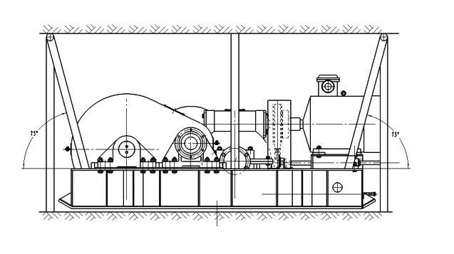 (2)固定絞車的方法可用6根支柱來固定,絞車前面的兩根支柱與巷道地面成75°交角,后面的兩根支柱與巷道底板成70°至80°交角,中間兩根支柱與底板垂直,每根支柱的下端都支撐在絞車底座的大槽鋼上,上端支撐在巷道的棚梁上,也可加設(shè)地錨和借助與底腳孔進(jìn)行固定。